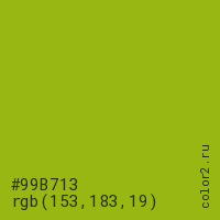Цвет #99B713 в цветовой модели RGB обозначается тремя октетами (153, 183, 19) в десятичном формате и #99B713 в шестнадцатиричном (hex) формате, которые являются интенсивностью красного 153 (hex 99), интенсивность зелёного 183 (hex B7) и интенсивность синего 19 (hex 13).