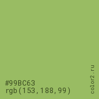 Цвет #99BC63 в цветовой модели RGB обозначается тремя октетами (153, 188, 99) в десятичном формате и #99BC63 в шестнадцатиричном (hex) формате, которые являются интенсивностью красного 153 (hex 99), интенсивность зелёного 188 (hex BC) и интенсивность синего 99 (hex 63).