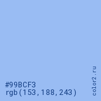 Цвет #99BCF3 в цветовой модели RGB обозначается тремя октетами (153, 188, 243) в десятичном формате и #99BCF3 в шестнадцатиричном (hex) формате, которые являются интенсивностью красного 153 (hex 99), интенсивность зелёного 188 (hex BC) и интенсивность синего 243 (hex F3).
