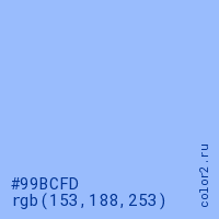 Цвет #99BCFD в цветовой модели RGB обозначается тремя октетами (153, 188, 253) в десятичном формате и #99BCFD в шестнадцатиричном (hex) формате, которые являются интенсивностью красного 153 (hex 99), интенсивность зелёного 188 (hex BC) и интенсивность синего 253 (hex FD).