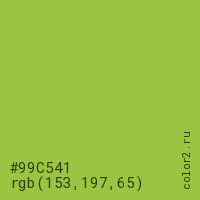 Цвет #99C541 в цветовой модели RGB обозначается тремя октетами (153, 197, 65) в десятичном формате и #99C541 в шестнадцатиричном (hex) формате, которые являются интенсивностью красного 153 (hex 99), интенсивность зелёного 197 (hex C5) и интенсивность синего 65 (hex 41).