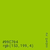 Цвет #99C704 в цветовой модели RGB обозначается тремя октетами (153, 199, 4) в десятичном формате и #99C704 в шестнадцатиричном (hex) формате, которые являются интенсивностью красного 153 (hex 99), интенсивность зелёного 199 (hex C7) и интенсивность синего 4 (hex 04).