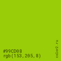 Цвет #99CD08 в цветовой модели RGB обозначается тремя октетами (153, 205, 8) в десятичном формате и #99CD08 в шестнадцатиричном (hex) формате, которые являются интенсивностью красного 153 (hex 99), интенсивность зелёного 205 (hex CD) и интенсивность синего 8 (hex 08).