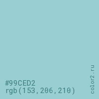 Цвет #99CED2 в цветовой модели RGB обозначается тремя октетами (153, 206, 210) в десятичном формате и #99CED2 в шестнадцатиричном (hex) формате, которые являются интенсивностью красного 153 (hex 99), интенсивность зелёного 206 (hex CE) и интенсивность синего 210 (hex D2).