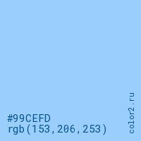 Цвет #99CEFD в цветовой модели RGB обозначается тремя октетами (153, 206, 253) в десятичном формате и #99CEFD в шестнадцатиричном (hex) формате, которые являются интенсивностью красного 153 (hex 99), интенсивность зелёного 206 (hex CE) и интенсивность синего 253 (hex FD).