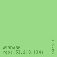 Цвет #99DA86 в цветовой модели RGB обозначается тремя октетами (153, 218, 134) в десятичном формате и #99DA86 в шестнадцатиричном (hex) формате, которые являются интенсивностью красного 153 (hex 99), интенсивность зелёного 218 (hex DA) и интенсивность синего 134 (hex 86).