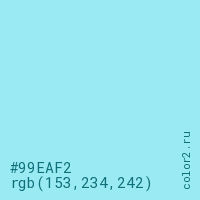 Цвет #99EAF2 в цветовой модели RGB обозначается тремя октетами (153, 234, 242) в десятичном формате и #99EAF2 в шестнадцатиричном (hex) формате, которые являются интенсивностью красного 153 (hex 99), интенсивность зелёного 234 (hex EA) и интенсивность синего 242 (hex F2).