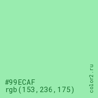 Цвет #99ECAF в цветовой модели RGB обозначается тремя октетами (153, 236, 175) в десятичном формате и #99ECAF в шестнадцатиричном (hex) формате, которые являются интенсивностью красного 153 (hex 99), интенсивность зелёного 236 (hex EC) и интенсивность синего 175 (hex AF).