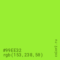 Цвет #99EE32 в цветовой модели RGB обозначается тремя октетами (153, 238, 50) в десятичном формате и #99EE32 в шестнадцатиричном (hex) формате, которые являются интенсивностью красного 153 (hex 99), интенсивность зелёного 238 (hex EE) и интенсивность синего 50 (hex 32).