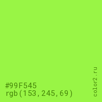 Цвет #99F545 в цветовой модели RGB обозначается тремя октетами (153, 245, 69) в десятичном формате и #99F545 в шестнадцатиричном (hex) формате, которые являются интенсивностью красного 153 (hex 99), интенсивность зелёного 245 (hex F5) и интенсивность синего 69 (hex 45).