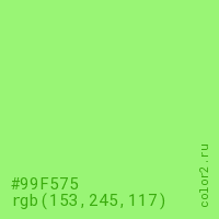 Цвет #99F575 в цветовой модели RGB обозначается тремя октетами (153, 245, 117) в десятичном формате и #99F575 в шестнадцатиричном (hex) формате, которые являются интенсивностью красного 153 (hex 99), интенсивность зелёного 245 (hex F5) и интенсивность синего 117 (hex 75).