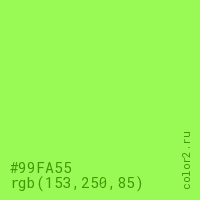 Цвет #99FA55 в цветовой модели RGB обозначается тремя октетами (153, 250, 85) в десятичном формате и #99FA55 в шестнадцатиричном (hex) формате, которые являются интенсивностью красного 153 (hex 99), интенсивность зелёного 250 (hex FA) и интенсивность синего 85 (hex 55).