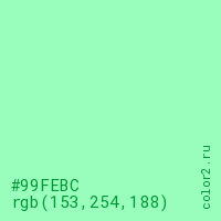 Цвет #99FEBC в цветовой модели RGB обозначается тремя октетами (153, 254, 188) в десятичном формате и #99FEBC в шестнадцатиричном (hex) формате, которые являются интенсивностью красного 153 (hex 99), интенсивность зелёного 254 (hex FE) и интенсивность синего 188 (hex BC).