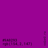Цвет #9A0293 в цветовой модели RGB обозначается тремя октетами (154, 2, 147) в десятичном формате и #9A0293 в шестнадцатиричном (hex) формате, которые являются интенсивностью красного 154 (hex 9A), интенсивность зелёного 2 (hex 02) и интенсивность синего 147 (hex 93).