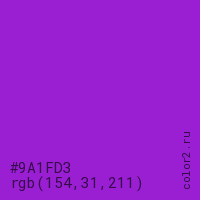 Цвет #9A1FD3 в цветовой модели RGB обозначается тремя октетами (154, 31, 211) в десятичном формате и #9A1FD3 в шестнадцатиричном (hex) формате, которые являются интенсивностью красного 154 (hex 9A), интенсивность зелёного 31 (hex 1F) и интенсивность синего 211 (hex D3).