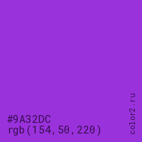 Цвет #9A32DC в цветовой модели RGB обозначается тремя октетами (154, 50, 220) в десятичном формате и #9A32DC в шестнадцатиричном (hex) формате, которые являются интенсивностью красного 154 (hex 9A), интенсивность зелёного 50 (hex 32) и интенсивность синего 220 (hex DC).