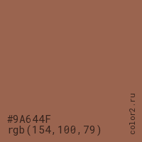 Цвет #9A644F в цветовой модели RGB обозначается тремя октетами (154, 100, 79) в десятичном формате и #9A644F в шестнадцатиричном (hex) формате, которые являются интенсивностью красного 154 (hex 9A), интенсивность зелёного 100 (hex 64) и интенсивность синего 79 (hex 4F).