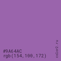 Цвет #9A64AC в цветовой модели RGB обозначается тремя октетами (154, 100, 172) в десятичном формате и #9A64AC в шестнадцатиричном (hex) формате, которые являются интенсивностью красного 154 (hex 9A), интенсивность зелёного 100 (hex 64) и интенсивность синего 172 (hex AC).