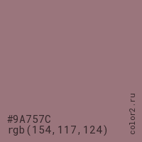 Цвет #9A757C в цветовой модели RGB обозначается тремя октетами (154, 117, 124) в десятичном формате и #9A757C в шестнадцатиричном (hex) формате, которые являются интенсивностью красного 154 (hex 9A), интенсивность зелёного 117 (hex 75) и интенсивность синего 124 (hex 7C).