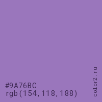 Цвет #9A76BC в цветовой модели RGB обозначается тремя октетами (154, 118, 188) в десятичном формате и #9A76BC в шестнадцатиричном (hex) формате, которые являются интенсивностью красного 154 (hex 9A), интенсивность зелёного 118 (hex 76) и интенсивность синего 188 (hex BC).