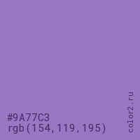 Цвет #9A77C3 в цветовой модели RGB обозначается тремя октетами (154, 119, 195) в десятичном формате и #9A77C3 в шестнадцатиричном (hex) формате, которые являются интенсивностью красного 154 (hex 9A), интенсивность зелёного 119 (hex 77) и интенсивность синего 195 (hex C3).