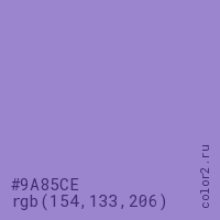 Цвет #9A85CE в цветовой модели RGB обозначается тремя октетами (154, 133, 206) в десятичном формате и #9A85CE в шестнадцатиричном (hex) формате, которые являются интенсивностью красного 154 (hex 9A), интенсивность зелёного 133 (hex 85) и интенсивность синего 206 (hex CE).