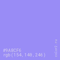 Цвет #9A8CF6 в цветовой модели RGB обозначается тремя октетами (154, 140, 246) в десятичном формате и #9A8CF6 в шестнадцатиричном (hex) формате, которые являются интенсивностью красного 154 (hex 9A), интенсивность зелёного 140 (hex 8C) и интенсивность синего 246 (hex F6).