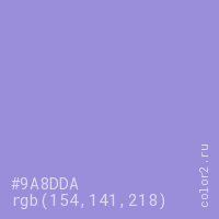 Цвет #9A8DDA в цветовой модели RGB обозначается тремя октетами (154, 141, 218) в десятичном формате и #9A8DDA в шестнадцатиричном (hex) формате, которые являются интенсивностью красного 154 (hex 9A), интенсивность зелёного 141 (hex 8D) и интенсивность синего 218 (hex DA).