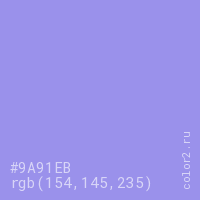 Цвет #9A91EB в цветовой модели RGB обозначается тремя октетами (154, 145, 235) в десятичном формате и #9A91EB в шестнадцатиричном (hex) формате, которые являются интенсивностью красного 154 (hex 9A), интенсивность зелёного 145 (hex 91) и интенсивность синего 235 (hex EB).