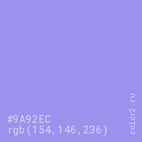 Цвет #9A92EC в цветовой модели RGB обозначается тремя октетами (154, 146, 236) в десятичном формате и #9A92EC в шестнадцатиричном (hex) формате, которые являются интенсивностью красного 154 (hex 9A), интенсивность зелёного 146 (hex 92) и интенсивность синего 236 (hex EC).