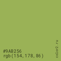 Цвет #9AB256 в цветовой модели RGB обозначается тремя октетами (154, 178, 86) в десятичном формате и #9AB256 в шестнадцатиричном (hex) формате, которые являются интенсивностью красного 154 (hex 9A), интенсивность зелёного 178 (hex B2) и интенсивность синего 86 (hex 56).