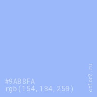 Цвет #9AB8FA в цветовой модели RGB обозначается тремя октетами (154, 184, 250) в десятичном формате и #9AB8FA в шестнадцатиричном (hex) формате, которые являются интенсивностью красного 154 (hex 9A), интенсивность зелёного 184 (hex B8) и интенсивность синего 250 (hex FA).