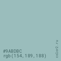 Цвет #9ABDBC в цветовой модели RGB обозначается тремя октетами (154, 189, 188) в десятичном формате и #9ABDBC в шестнадцатиричном (hex) формате, которые являются интенсивностью красного 154 (hex 9A), интенсивность зелёного 189 (hex BD) и интенсивность синего 188 (hex BC).