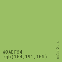Цвет #9ABF64 в цветовой модели RGB обозначается тремя октетами (154, 191, 100) в десятичном формате и #9ABF64 в шестнадцатиричном (hex) формате, которые являются интенсивностью красного 154 (hex 9A), интенсивность зелёного 191 (hex BF) и интенсивность синего 100 (hex 64).
