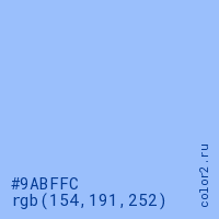 Цвет #9ABFFC в цветовой модели RGB обозначается тремя октетами (154, 191, 252) в десятичном формате и #9ABFFC в шестнадцатиричном (hex) формате, которые являются интенсивностью красного 154 (hex 9A), интенсивность зелёного 191 (hex BF) и интенсивность синего 252 (hex FC).
