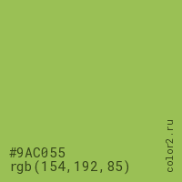 Цвет #9AC055 в цветовой модели RGB обозначается тремя октетами (154, 192, 85) в десятичном формате и #9AC055 в шестнадцатиричном (hex) формате, которые являются интенсивностью красного 154 (hex 9A), интенсивность зелёного 192 (hex C0) и интенсивность синего 85 (hex 55).