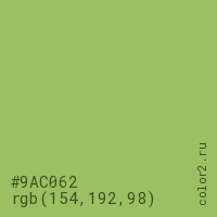 Цвет #9AC062 в цветовой модели RGB обозначается тремя октетами (154, 192, 98) в десятичном формате и #9AC062 в шестнадцатиричном (hex) формате, которые являются интенсивностью красного 154 (hex 9A), интенсивность зелёного 192 (hex C0) и интенсивность синего 98 (hex 62).