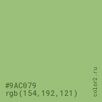 Цвет #9AC079 в цветовой модели RGB обозначается тремя октетами (154, 192, 121) в десятичном формате и #9AC079 в шестнадцатиричном (hex) формате, которые являются интенсивностью красного 154 (hex 9A), интенсивность зелёного 192 (hex C0) и интенсивность синего 121 (hex 79).