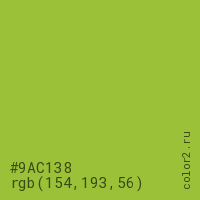 Цвет #9AC138 в цветовой модели RGB обозначается тремя октетами (154, 193, 56) в десятичном формате и #9AC138 в шестнадцатиричном (hex) формате, которые являются интенсивностью красного 154 (hex 9A), интенсивность зелёного 193 (hex C1) и интенсивность синего 56 (hex 38).
