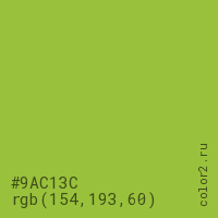 Цвет #9AC13C в цветовой модели RGB обозначается тремя октетами (154, 193, 60) в десятичном формате и #9AC13C в шестнадцатиричном (hex) формате, которые являются интенсивностью красного 154 (hex 9A), интенсивность зелёного 193 (hex C1) и интенсивность синего 60 (hex 3C).