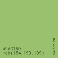 Цвет #9AC16D в цветовой модели RGB обозначается тремя октетами (154, 193, 109) в десятичном формате и #9AC16D в шестнадцатиричном (hex) формате, которые являются интенсивностью красного 154 (hex 9A), интенсивность зелёного 193 (hex C1) и интенсивность синего 109 (hex 6D).