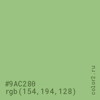 Цвет #9AC280 в цветовой модели RGB обозначается тремя октетами (154, 194, 128) в десятичном формате и #9AC280 в шестнадцатиричном (hex) формате, которые являются интенсивностью красного 154 (hex 9A), интенсивность зелёного 194 (hex C2) и интенсивность синего 128 (hex 80).
