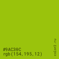 Цвет #9AC30C в цветовой модели RGB обозначается тремя октетами (154, 195, 12) в десятичном формате и #9AC30C в шестнадцатиричном (hex) формате, которые являются интенсивностью красного 154 (hex 9A), интенсивность зелёного 195 (hex C3) и интенсивность синего 12 (hex 0C).
