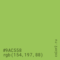 Цвет #9AC558 в цветовой модели RGB обозначается тремя октетами (154, 197, 88) в десятичном формате и #9AC558 в шестнадцатиричном (hex) формате, которые являются интенсивностью красного 154 (hex 9A), интенсивность зелёного 197 (hex C5) и интенсивность синего 88 (hex 58).
