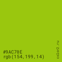 Цвет #9AC70E в цветовой модели RGB обозначается тремя октетами (154, 199, 14) в десятичном формате и #9AC70E в шестнадцатиричном (hex) формате, которые являются интенсивностью красного 154 (hex 9A), интенсивность зелёного 199 (hex C7) и интенсивность синего 14 (hex 0E).
