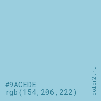 Цвет #9ACEDE в цветовой модели RGB обозначается тремя октетами (154, 206, 222) в десятичном формате и #9ACEDE в шестнадцатиричном (hex) формате, которые являются интенсивностью красного 154 (hex 9A), интенсивность зелёного 206 (hex CE) и интенсивность синего 222 (hex DE).