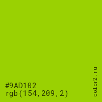 Цвет #9AD102 в цветовой модели RGB обозначается тремя октетами (154, 209, 2) в десятичном формате и #9AD102 в шестнадцатиричном (hex) формате, которые являются интенсивностью красного 154 (hex 9A), интенсивность зелёного 209 (hex D1) и интенсивность синего 2 (hex 02).