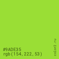 Цвет #9ADE35 в цветовой модели RGB обозначается тремя октетами (154, 222, 53) в десятичном формате и #9ADE35 в шестнадцатиричном (hex) формате, которые являются интенсивностью красного 154 (hex 9A), интенсивность зелёного 222 (hex DE) и интенсивность синего 53 (hex 35).