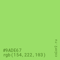 Цвет #9ADE67 в цветовой модели RGB обозначается тремя октетами (154, 222, 103) в десятичном формате и #9ADE67 в шестнадцатиричном (hex) формате, которые являются интенсивностью красного 154 (hex 9A), интенсивность зелёного 222 (hex DE) и интенсивность синего 103 (hex 67).