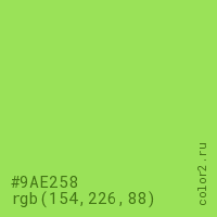 Цвет #9AE258 в цветовой модели RGB обозначается тремя октетами (154, 226, 88) в десятичном формате и #9AE258 в шестнадцатиричном (hex) формате, которые являются интенсивностью красного 154 (hex 9A), интенсивность зелёного 226 (hex E2) и интенсивность синего 88 (hex 58).